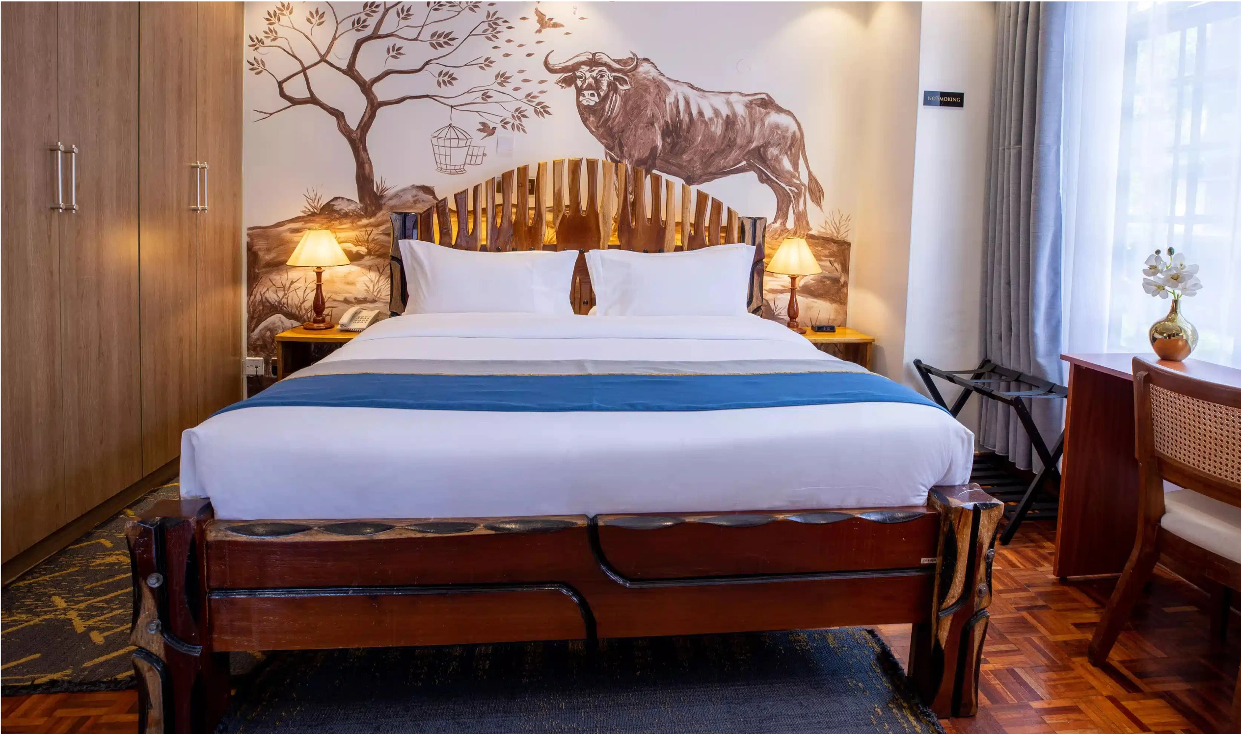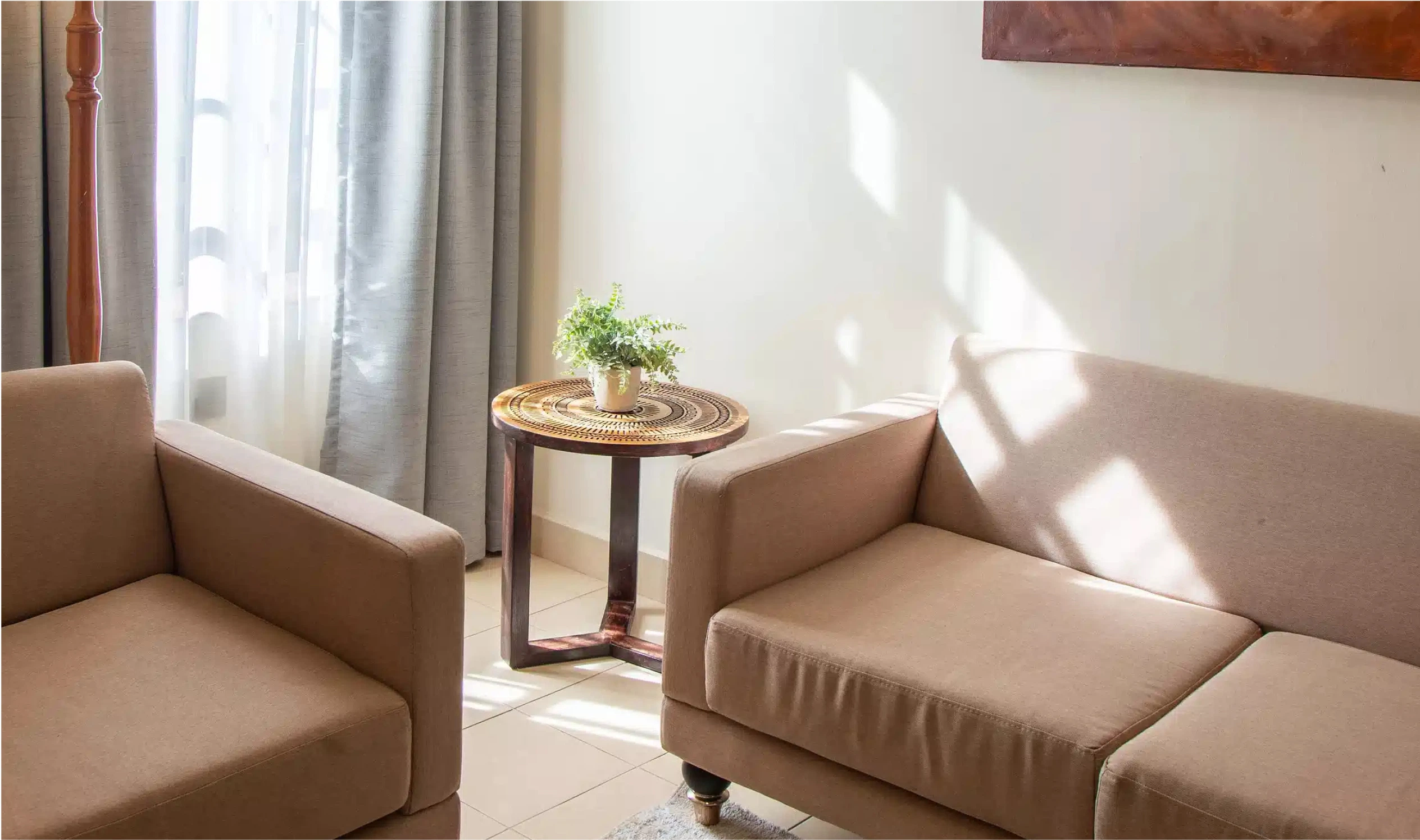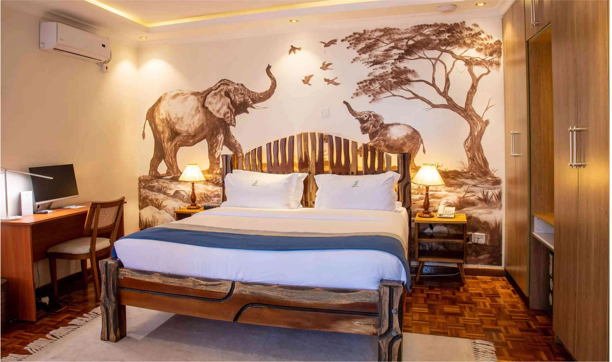 Our Presidential Suite offers a refined escape, blending African elegance with modern luxury. Enjoy a fully equipped kitchenette, a cozy furnished balcony overlooking serene greenery, and a lavish bathroom for ultimate relaxation. Perfect for long stays or quick work trips, every detail reflects Kenya's rich culture with a touch of indulgence