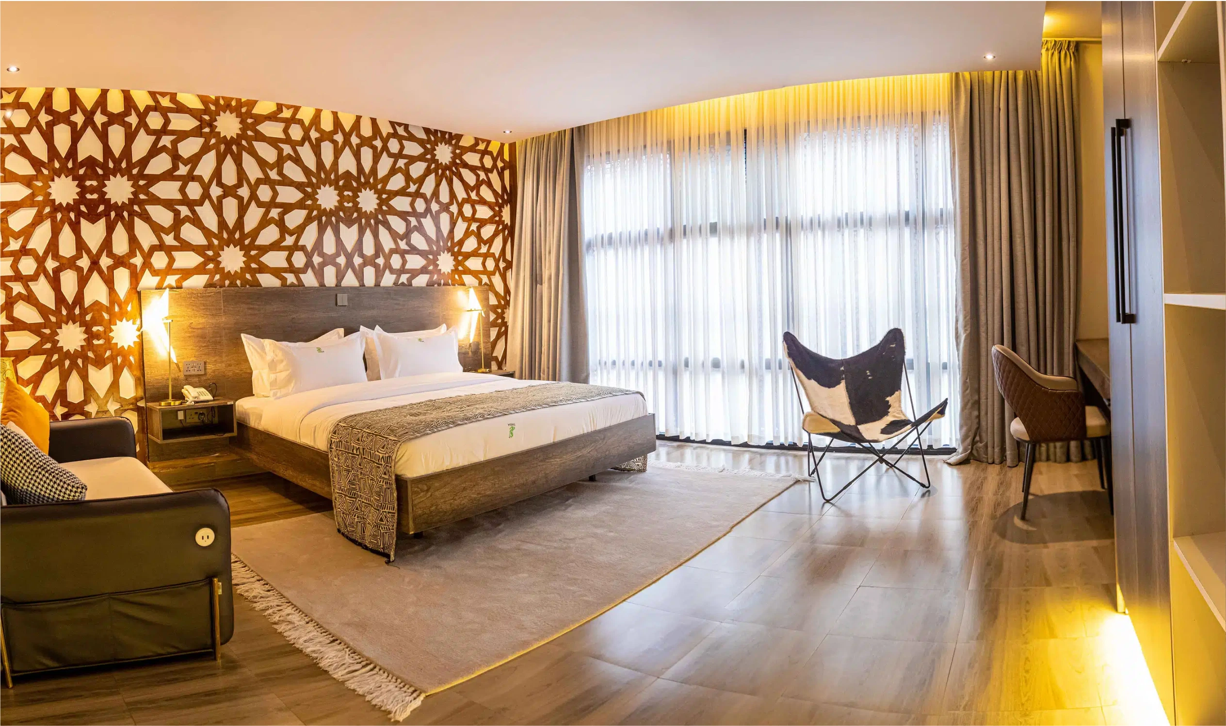 Inspired by Moroccan decor, this elegantly designed Deluxe Room features a beautifully crafted interior, a modern bathroom, and abundant natural light, creating a warm and inviting atmosphere.