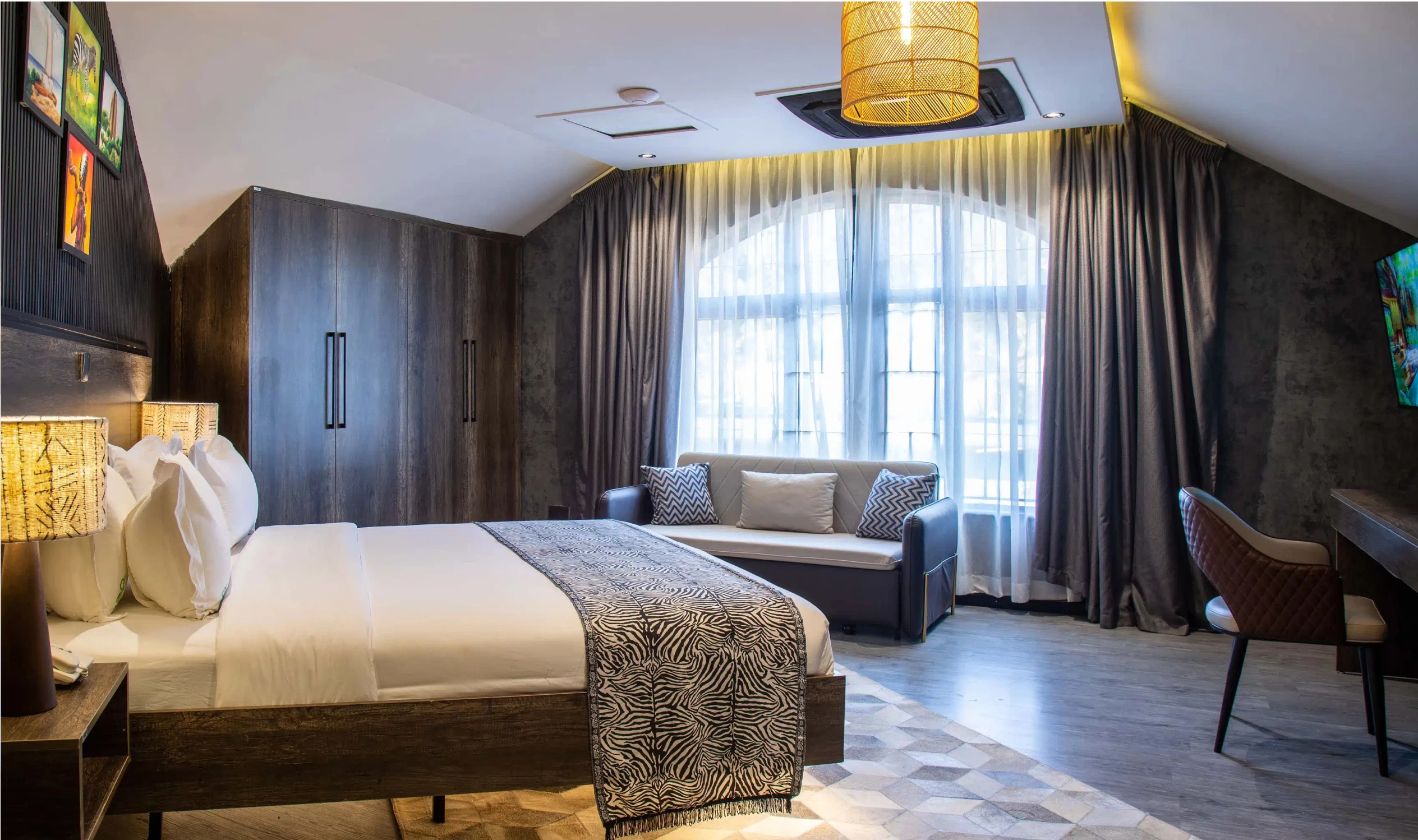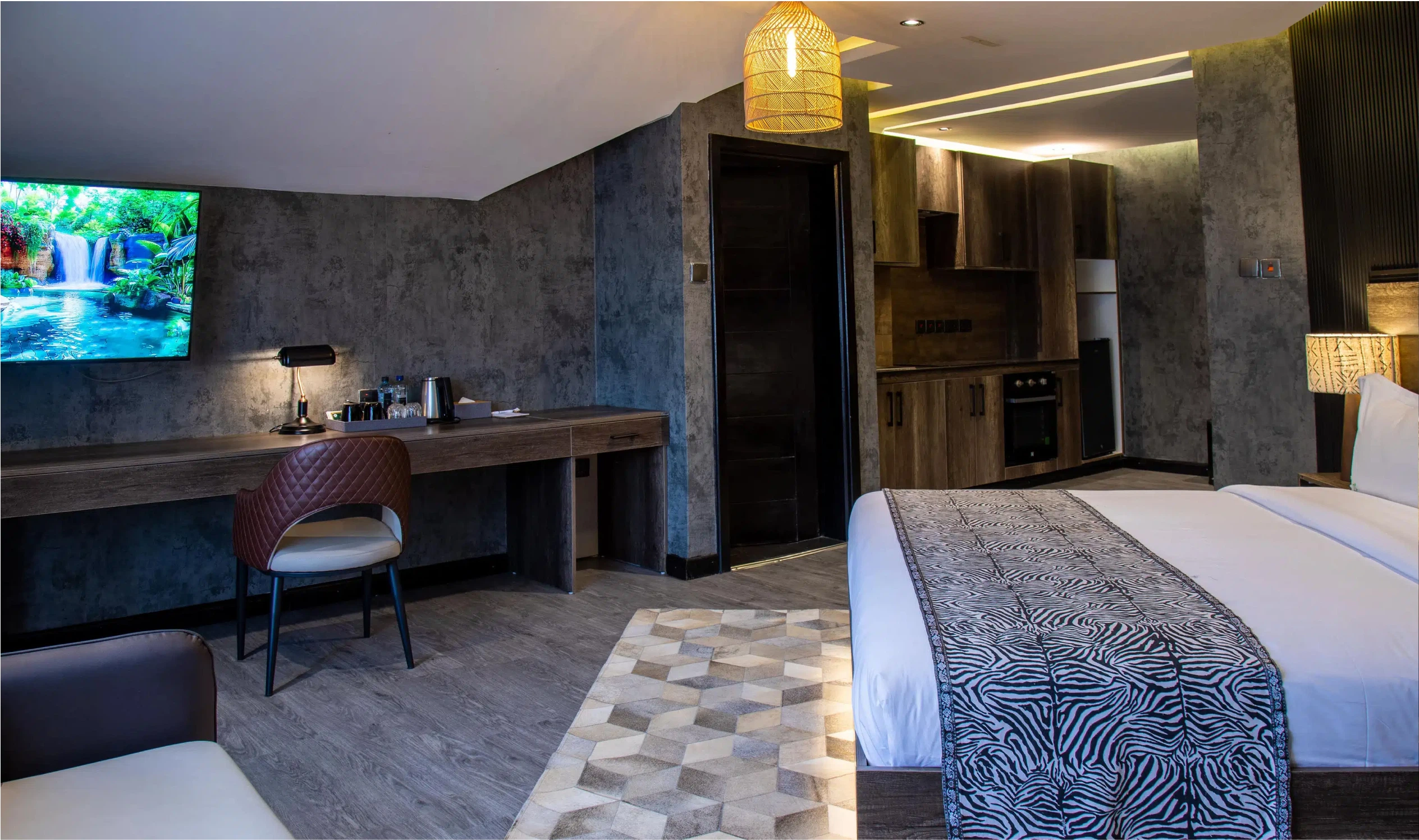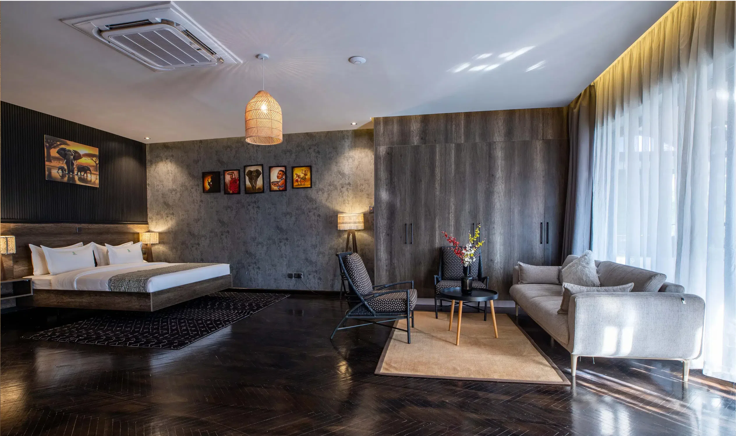 Inspired by African and Moroccan design, this spacious Executive Room features a modern bathroom, a fully equipped kitchenette, and an airy floor plan. Step outside to a private dining or sitting area, surrounded by lush greenery that enhances both privacy and relaxation, creating a serene escape.
