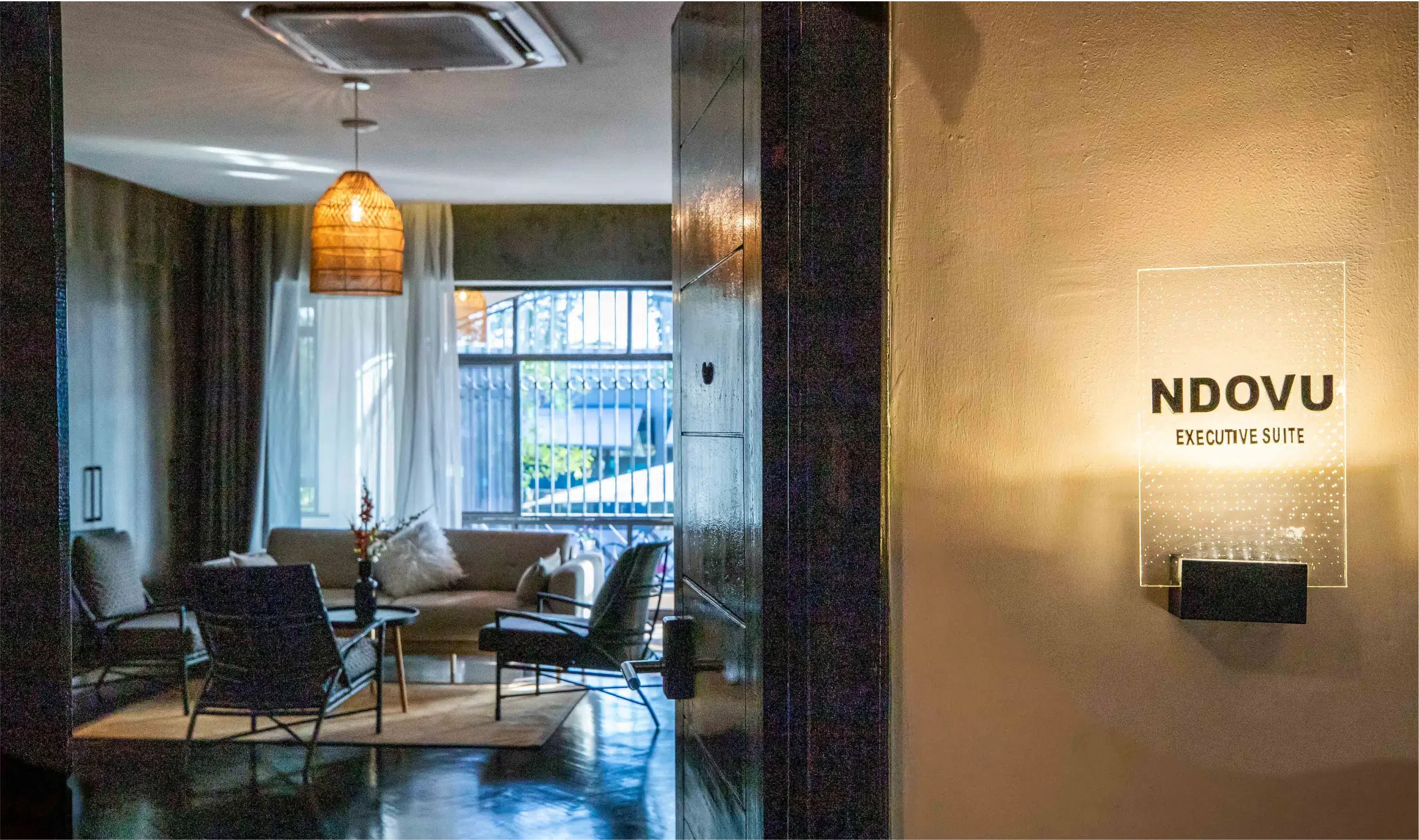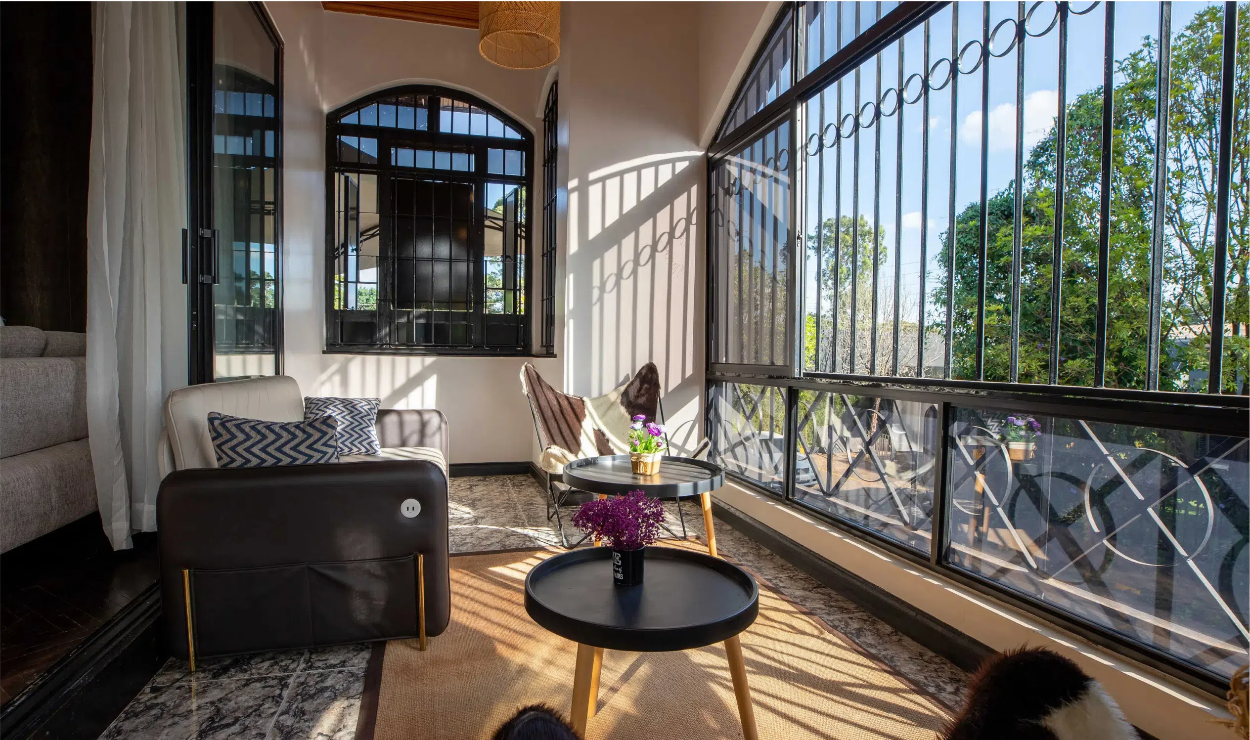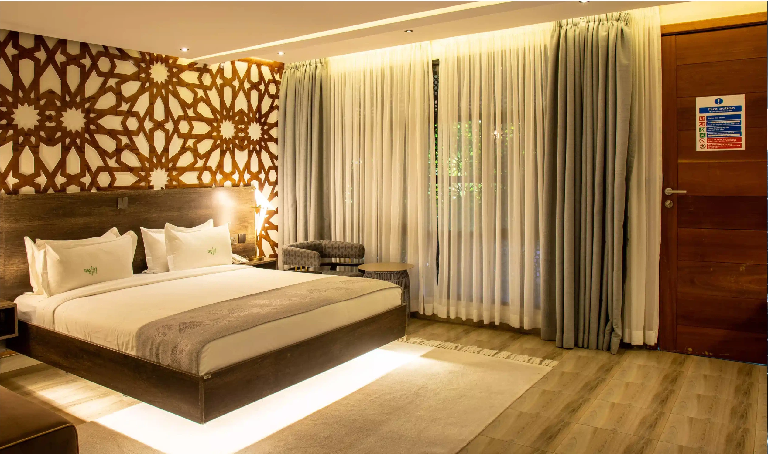 Inspired by African and Moroccan design, this spacious Executive Room features a modern bathroom, a fully equipped kitchenette, and an airy floor plan. Step outside to a private dining or sitting area, surrounded by lush greenery that enhances both privacy and relaxation, creating a serene escape.