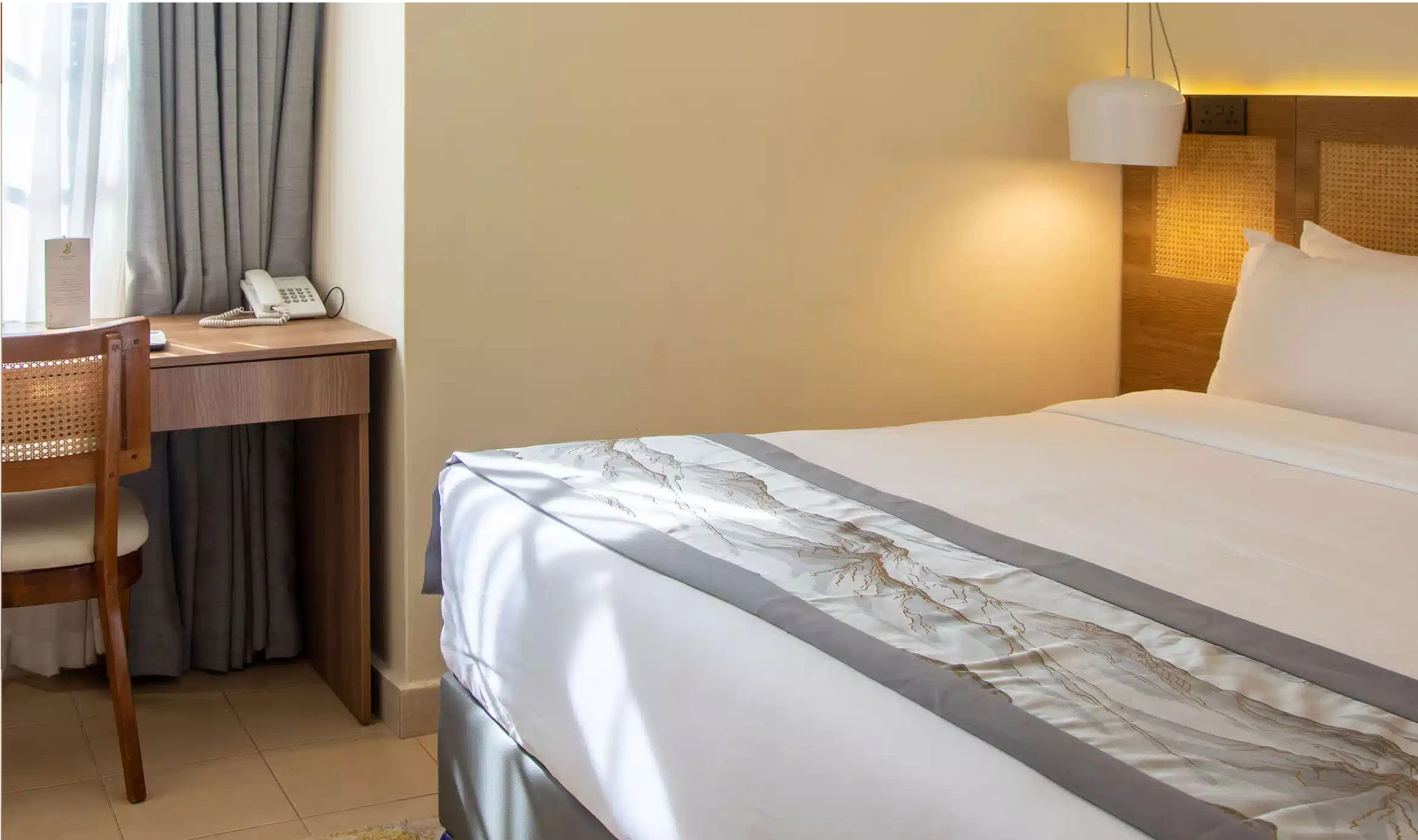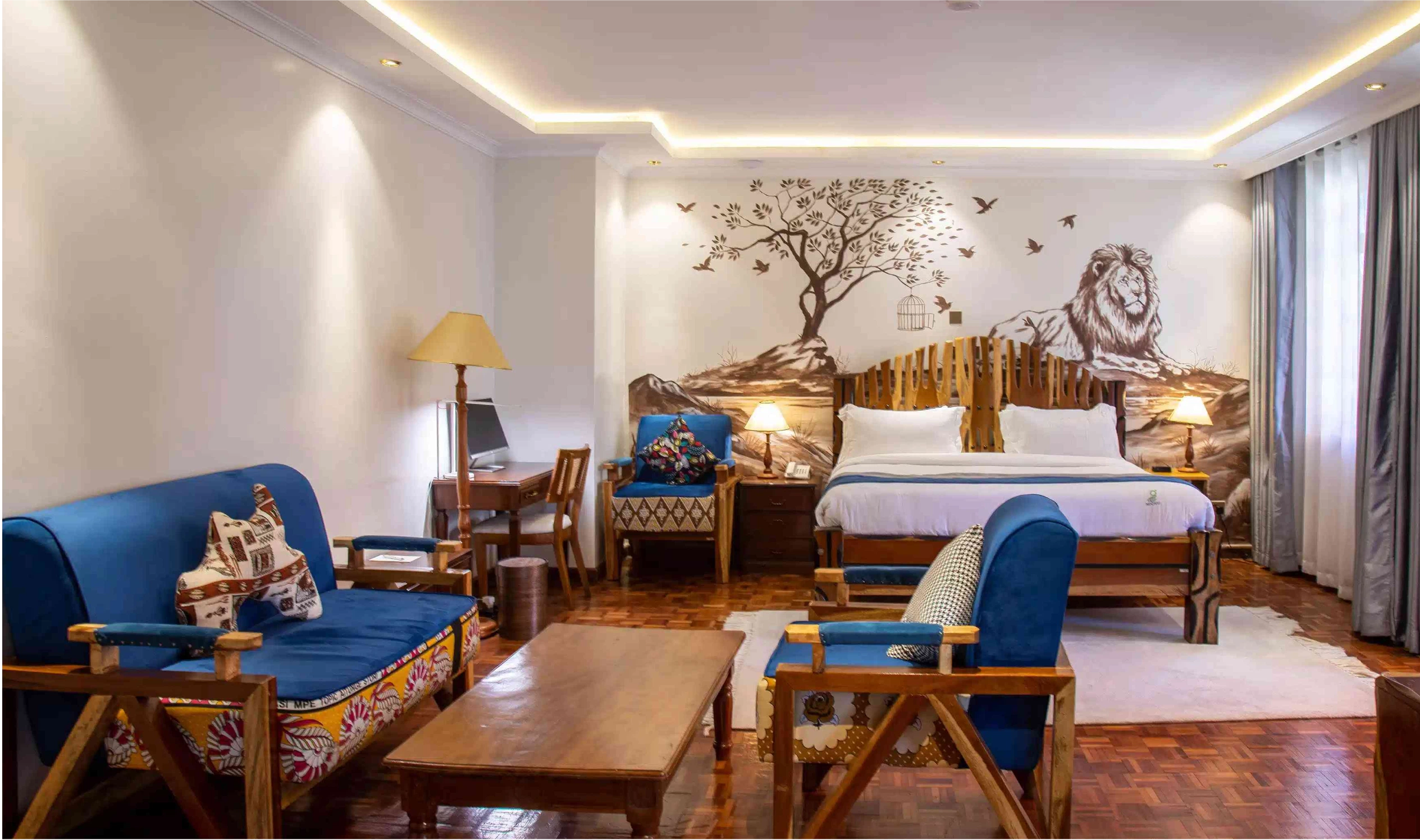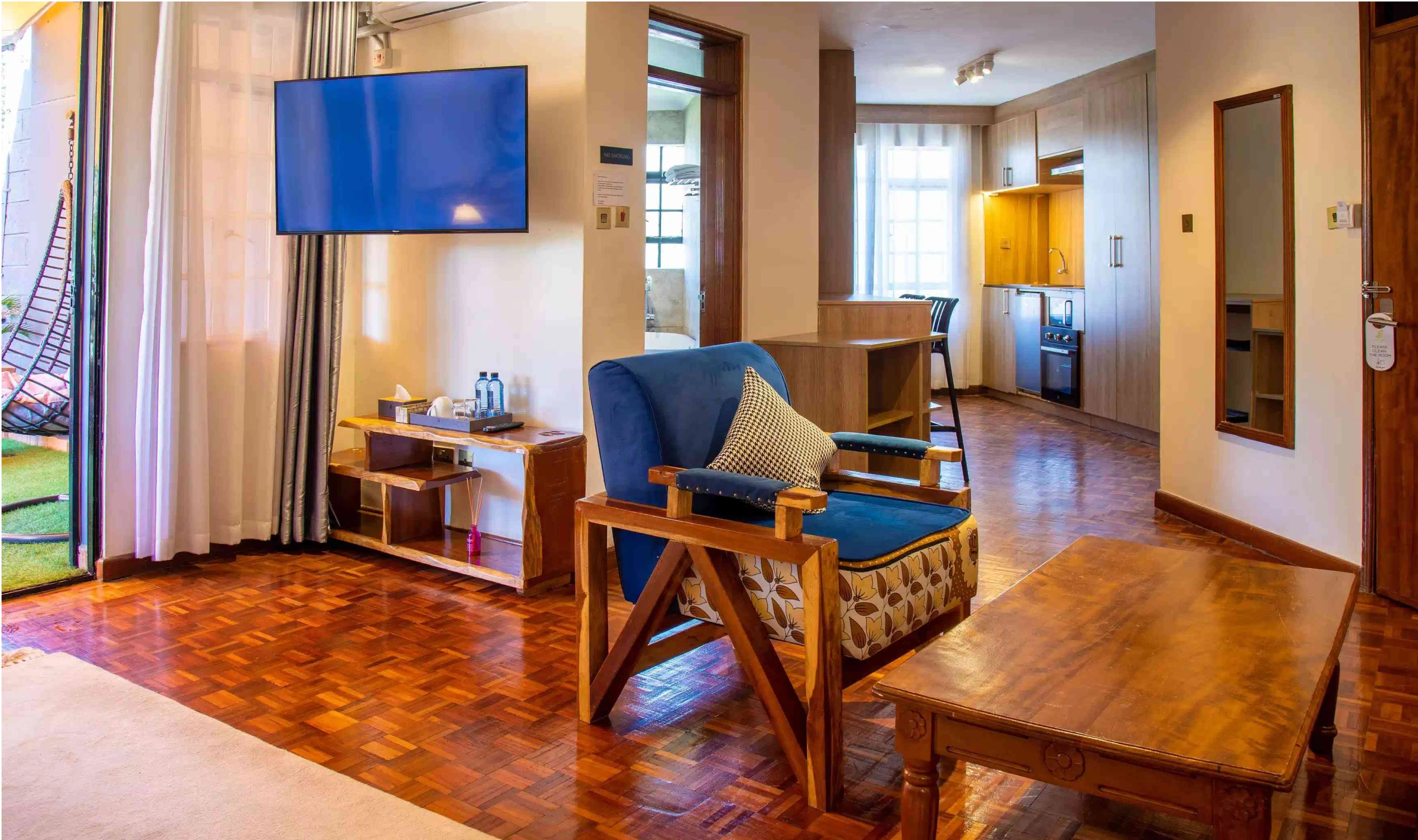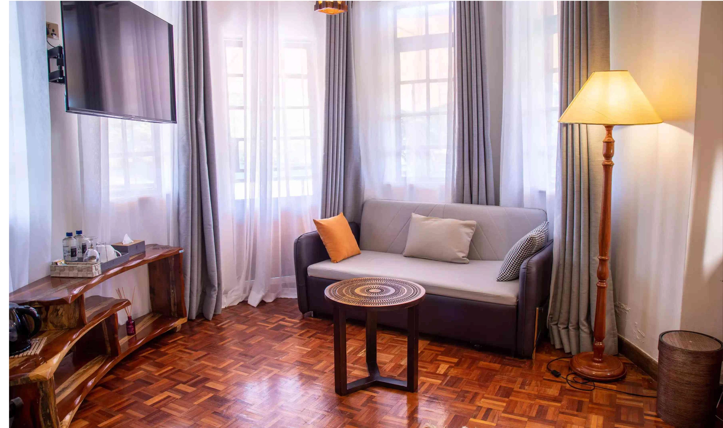 Our Presidential Suite offers a refined escape, blending African elegance with modern luxury. Enjoy a fully equipped kitchenette, a cozy furnished balcony overlooking serene greenery, and a lavish bathroom for ultimate relaxation. Perfect for long stays or quick work trips, every detail reflects Kenya's rich culture with a touch of indulgence