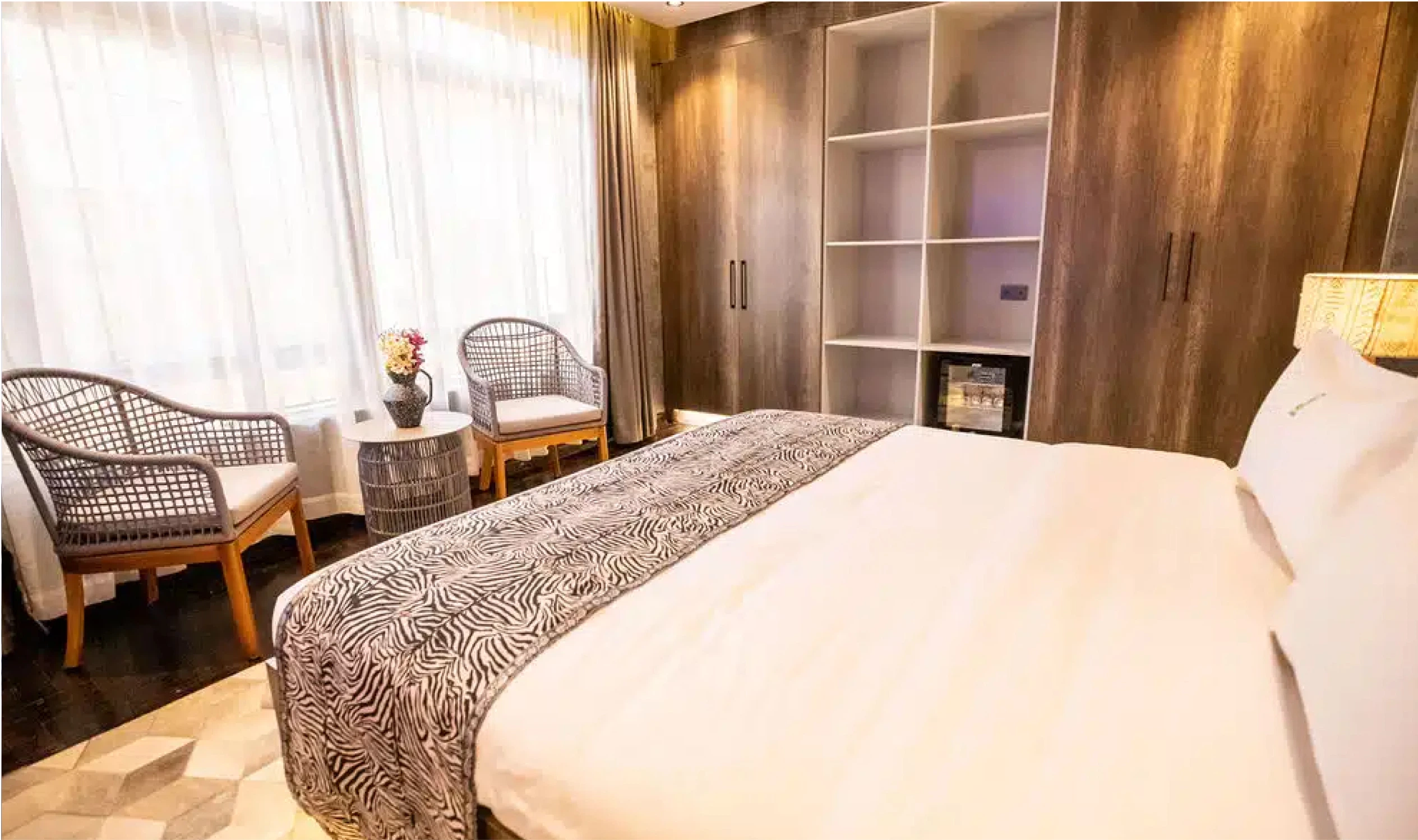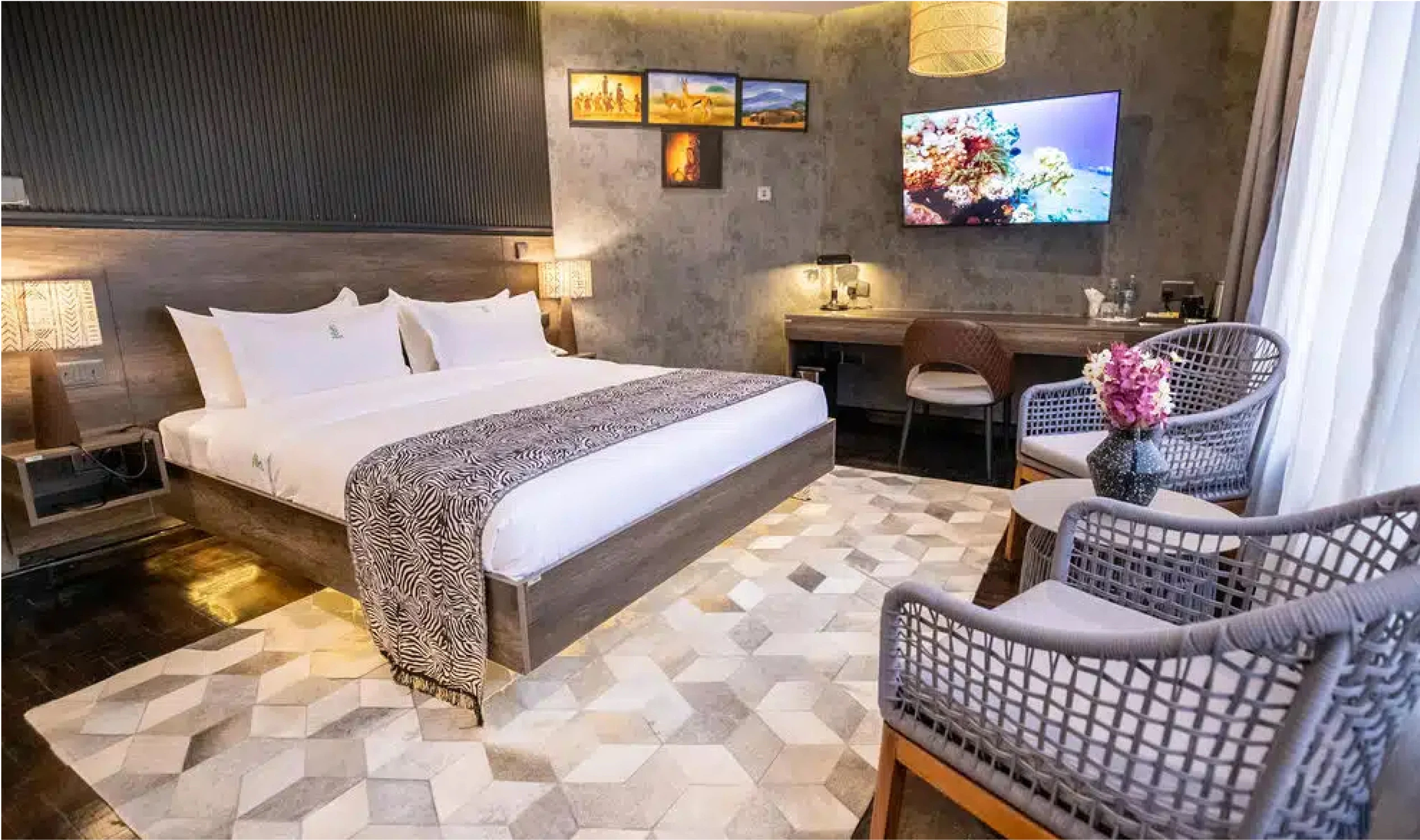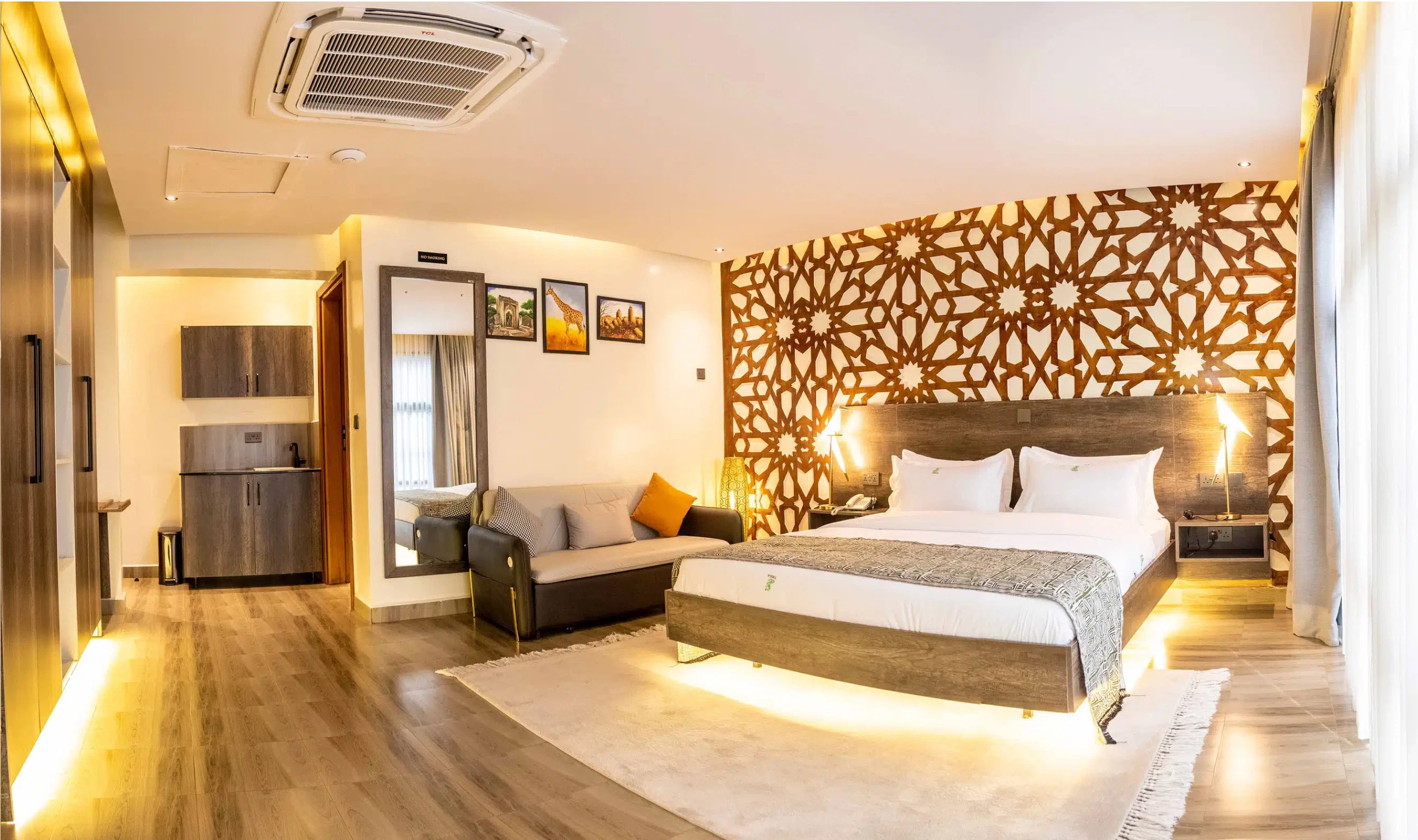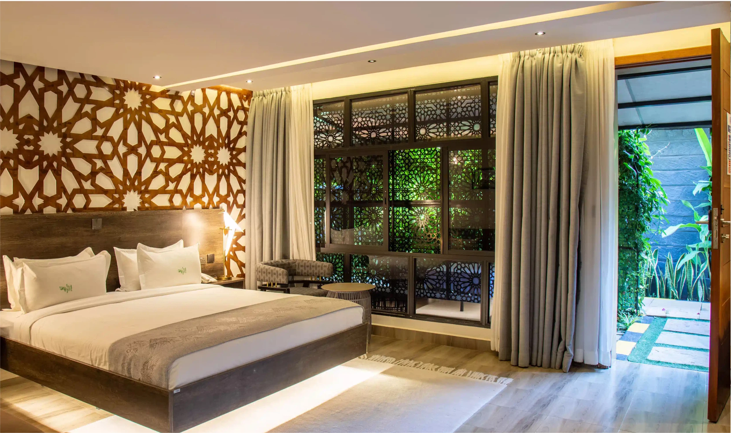 Inspired by African and Moroccan design, this spacious Executive Room features a modern bathroom, a fully equipped kitchenette, and an airy floor plan. Step outside to a private dining or sitting area, surrounded by lush greenery that enhances both privacy and relaxation, creating a serene escape.